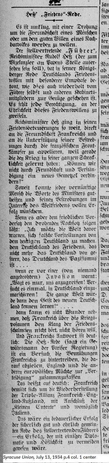 July 13, 1934 page 4 _____ It is unwise to issue threats in order to gain the friendship of a person or to solicit the good will of a neighboring people. The "acting" leader, Reich Minister Rudolf Hess (who has been chosen to take Vice-Chancellor von Papen's place) has placed particular emphasis in his Königsberg address on Germany's desire for peace just as it was repeatedly stated by the Führer himself and other Cabinet members. There's no reason to doubt the honesty of this desire for peace. Reich Minister Hess went so far in his peace assertion to call directly on France's friendship and on the support of his efforts by the French frontline fighters because they have learned the absolute horror of war. "Through friendship and understanding couldn't we prevent renewed carnage?" So far every reasonable human being could endorse the Minister's words and his efforts in the interest of world peace's complete success. But when the peaceful premise is followed by a threatening afterthought: "I would like to warn the world not to have false impressions of the Germany of today, the Germany of peace, which is no longer the Germany of yesterday, the Germany of pacifism ..." And if he is warned about an invasion (threatened by no one): "Just dare to attack us! Try marching even once into Germany! The entire world would then learn the spirit of the new Germany!..." "Then it won't take any imagination that France won't hear the pipes of peace over the trumpets of war and doesn't want to hear them." France's response is meaningful" The Hess speech (states an informant of the Paris government) is an attempt to frustrate France's efforts which aim to bring England and the other European powers together in "defense." In German this means" France will endeavor to restore the Triple Alliance of France-England-Russia along with members of the "Little Entente" and possibly Italy. That would produce a regrettable consequence to the good and honorably meant speech by the acting Führer — an outcome which would take some diplomacy and politeness to prevent. |