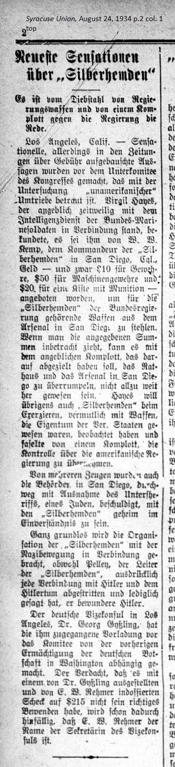 August 24, 1934 page 5 _____ There's Talk about Theft of Government Weaponry and a Plot against the Government. Los Angeles, Calif. — Sensational reports have been made in all the newspapers concerning excessively exaggerated testimony before the Subcommittee of Congress investigating "unamerican activities." Virgil Hayes, who allegedly had connections with soldiers from the Intelligence Service of the German Navy, testified that he was offered $10 for rifles, $50 for machine guns and $20 for cases of ammunition from W.W. Kemp, Commander of the "Silver Shirts" of San Diego, Cal. The Silver Shirts wanted him to steal the weapons from the Federal Arsenal in San Diego. If one considers the offered sums, it's not too farfetched to link it with a plot to steal the weapons from the Arsenal. Hayes was allegedly also observed at the Silvershirt exercises with the U.S. Government weapons and he alluded to a plot to take over control of the American government. There was also testimony from many witnesses that the authories in San Diego, with the exception of the undersheriff who was a Jew, were secretly in league with the Silver Shirts. Allegations that the Silvershirt organization was connected to the Nazi Movement were completely groundless when Pelley, the leader of the Silver Shirts, expressly denied any connection with Hitler and Hitlerdom, however he did say that he admired Hitler. The German Vice-Consul in Los Angeles, Dr. Georg Gyssling, had made his subpoenaed appearance before the Committee contingent upon approval by the German Embassy in Washington. The suspicion that a check for $215 was sent by Dr. Gyssling but endorsed by E.W. Rehmer might lead to something proved incorrect. E.W. Rehmer is the name of the secretary to the Vice-Consul. |