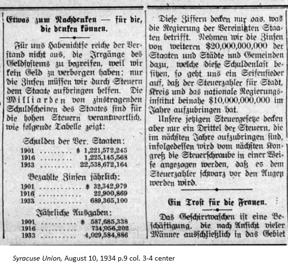 August 10, 1934 page 9 We Have-Nots can't understand the circuitous reasoning of the money system because we don't have any to lend. We only raise enough money with our taxes to pay the interest. The billions in interest-bearing debt are responsible for our hight taxes, as this table illustrates: The National Debt of the United States: