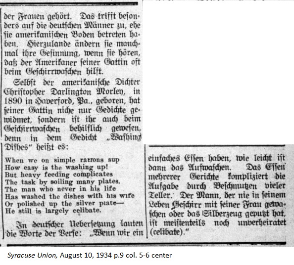 These figures only cover the federal government of the United States. Increase the interest by another $20,000,000,000 for the states, cities, and local communities which encumbered debt and the pot boils over and tax payer have to raise nearly $10,000,000,000 per year for city, state and national governmental institutions. Our current tax laws cover only a third of the taxes needed in the next year. As a result the next Congress will apply the screws to the taxpayers in such a way that they'll see black instead of red before their eyes. Words of Consolation for Women _____ According to many men, dishwashing is an activity belonging to the realm of women. That's especially true of German men before they reach American soil. Here things change somwehat when you hear that the American male often helps his wife with the dishwashing. Even the American poet Christopher Darlington Morley, who was born in Haverford Pa. in 1890, not only dedicated a poem to his wife but also helped her with the dishwashing. The poem is titled "Washing Dishes": When we on simple rations sup
