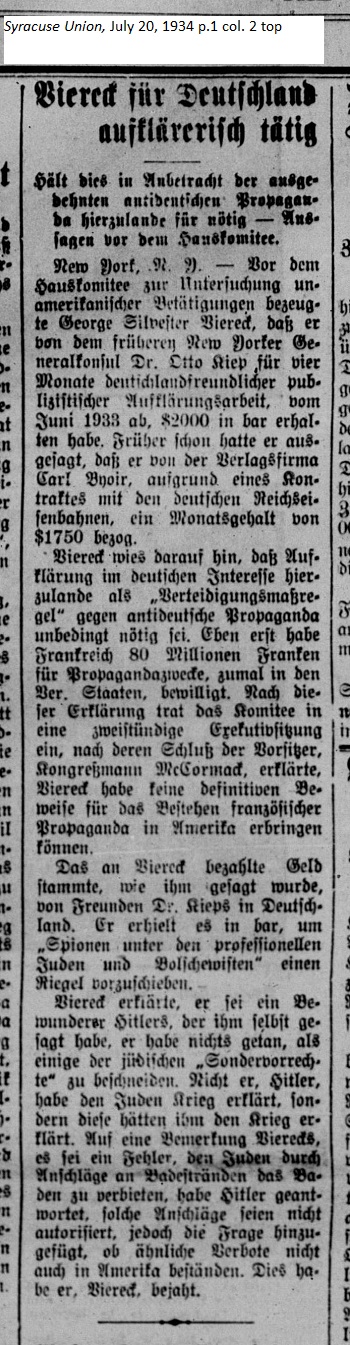 July 20, 1934 page 1 _____ Considered it necessary considering the Widespread Anti-German Propaganda here at home — Testimony before the House Committee New York, N.Y. — George Silvester Viereck testified before the House Committee investigating Unamerican Activities that he received $2000 Dollars in cash for four months starting in June 1933 for Germany-related police investigative work from the former New York General Consul, Dr. Otto Kiep. Earlier he had testified that he received a monthly salary of $1750 from the publishing firm of Carl Byoir while on contract with the German Reich Railway. Viereck indicated that reconnaissance into German interests here at home would be absolutely necessary as a "preventative measure" against anti-German propaganda. Just recently France approved 80 million Francs for propaganda purposes, particularly in the United States. After this statement the Committee went into a two-hour executive session after which the chairman, Congressman McCormack stated Viereck could not provide definitive proof for the existence of French propaganda in America. Viereck was told that the money he was paid came from friends of Dr. Kiep in Germany. He received it in cash to use on the pretext of defense against "spies among the professional Jews and Bolschevists." Viereck stated he was an admirer of Hitler, who told him he had done nothing other than to curtail a few of the Jewish "special privileges." Hitler hadn't declared war on the Jews; rather they had declared war on him. On a remark by Viereck that it might have been a mistake to forbid the Jews to swim at the beaches by means of assault, Hitler asnwered such assaults are not authorized, which raised the question whether similar bans did not also exist in America. Viereck replied in the affirmative. |