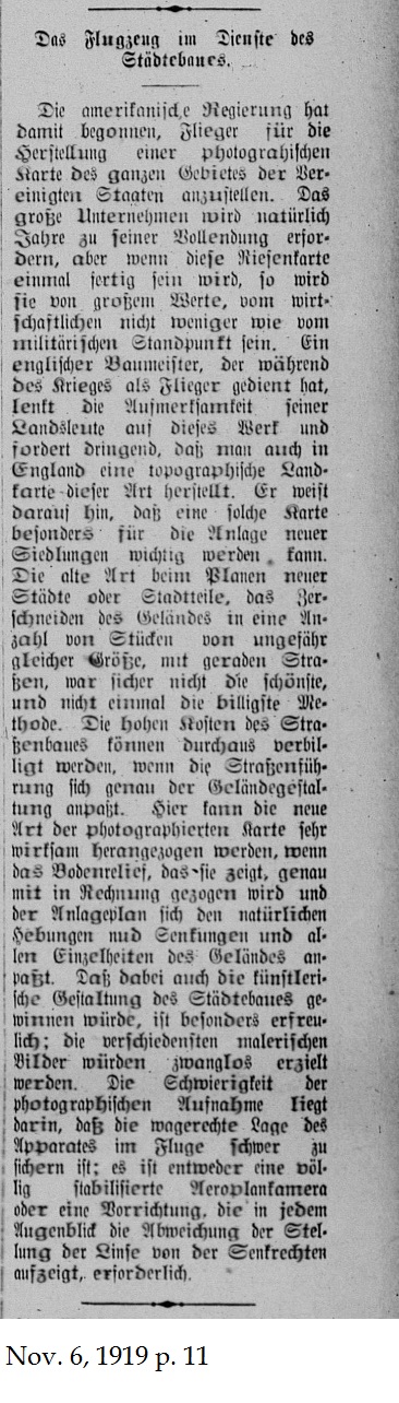 _____ The American government has begun hiring pilots to create photographic maps of the entire United States. Naturally this enormous untertaking will take years to complete but when the maps are finally finished they will be of great economic and military value. An English architect, who flew during the war, made his countrymen aware of this project and strongly recommended that England also produce topographic maps of this kind. He advised that such maps would be important to the planning of new settlements. The old means of city and village planning whereby lots were divided up into parcels of relatively equal size and joined by local roads was not the most attractive or cost-effective method. The high cost of building cities could be lessened if highway departments could identify the best sites to construct roads. New photographic maps would be of tremendous advantage if they showed the natural rise and fall of the landscape plus all characteristics of the countryside and were outfitted with surveyor calculations. The artistic design of cities would also result since various picturesque vistas could be achieved. The difficulty in this photographic endeavor would be in securing the cameras in a horizontal position during flight. You'd need either a fully stablized airplane camera or a contraption to adjust the camera lens at every moment to a perpendicular position. _____ Translator's Note: By 1921 The United States Air Mail Service had published Pilots' directions for various routes in text format. See the New York-San Francisco route at http://www.archivaria.com/PilotDirections/index.html |