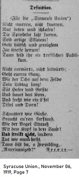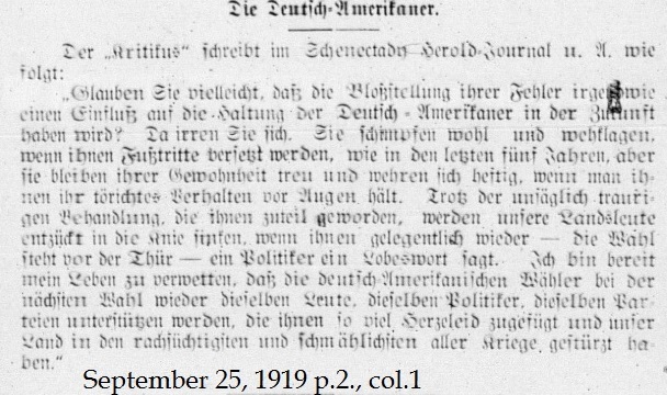 September 25, 1919, p.2 _____ The critic of the Schenectady Herold Journal and other publications writes as follows: Perhaps you believe that admitting your mistakes will somehow influence the behavior of German-Americans in the future? You're just fooling yourself. You insult and accuse them. You've been kicking them for the past five years, but they have remained true to their culture even when you considered it foolish behavior. Despite the unspeakably poor treatment you unleashed on them do you really think our countrymen will be pacified by you when it's time to vote again. Do you think they'll be swayed by a politican's words in praise? I'll bet my life that in the next election the German-American voters will not support the same people, the same politicians, and the same political parties that caused them so much heartache and prompted our country to participate in the most vengeful and shameless of all wars. |