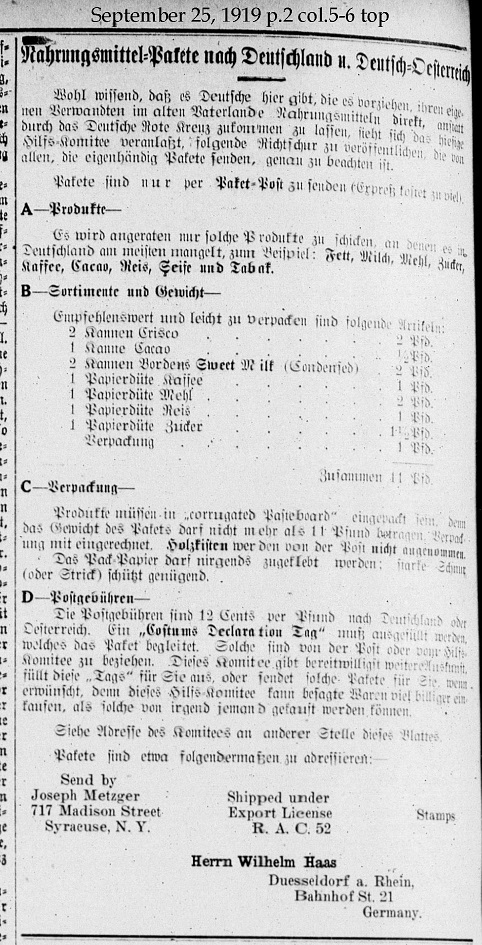It's well known that there are Germans living here who directly send their relatives in the old fatherland packages of food rather than going through the German Red Cross. The Central Relief Committee wishes to offer these guidelines which should be observed by those sending their own packages: Packages may only be send via Parcel Post (because Express Mail costs too much.) A. Products You are advised only to send those products which are most needed in Germany, for example: grease, milk, flour, sugar, coffee, cocoa, rice, soap, and tobacco. B. Product Line and Weight Recommended and easy to pack: