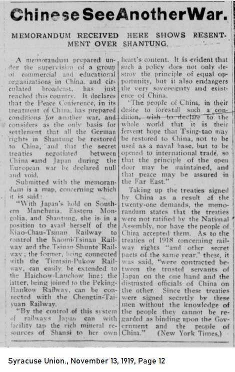 MEMORANDUM RECEIVED HERE SHOWS RESENTMENT OVER SHANTUNG A memorandum prepared under the supervision of a group of commercial and educational organizatons in China, and circulated broadcast has just reached this country. It declares that the Peace Conference, in its treatment of China, has prepared conditions for another war, and considers as the only basis for settlement that all the German rights in Shantung be restored to China, and that the secret treaties negotiated between China and Japan during the Europoean war be declared null and void. Submitted with the memorandum is a map, concerning which it is said: "With Japan's hold on Southern Manchuria, Eastern Mongolia and Shantung, she is in a position to avail herself of the Kiao-Chau-Tsinan Railway to control the Kaomi-Tsinan Railway and the Tsinan Shunte Railway; the former, being connected with the Tientsin-Pukow Railway, can easily be extended to the Haichow-Lanchow line: the latter, being joined to the Peking-Hankow Railway, can be connected with the Chengtin-Taiyuan Railway. "By the control if this system of railways Japan can with facility tap the rich mineral resources of Shansi to her own heart's content. It is evident that such a policy does not only destroy the principle of equal opportunity, but it also endangers the very sovereignty and existence of China. "The people of China, in their desire to forestall such a condition, wish to declare to the whole world that it is their fervent hope that Tsing-tao may be restored to China, not to be used as a naval base, but to be opened to international trade, so that the principle of the open door may be maintained, and that peace may be assured in the Far East." Taking up the treaties signed by China as a result of the twenty-one demands, the memorandum states that the treaties were not ratified by the National Assembly, nor have the people of China accepted them. As to the treaties of 1918 concerning railway rights "and other secret pacts of the same year," these, it was said, "were contracted between the trusted servants of Japan on the one hand and the distrusted officials in China on the other. Since these treaties were signed secretly by these men without the knowledge of the people they cannot be regarded as binding upon the Governmwent and the people of China." (New York Times) |