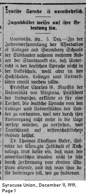 _____ The Education of Young People demonstrates Its Importance _____ Louisville, Ky, December 5 — At the annual meeting of the Association of Colleges and Secondary Schools of the Southern States several speakers raised the point that instruction in the German language should not just be given in elementary schools but in high schools, colleges, and universities. Professor Charles G. Maphis of the University of Virginia and current president of the association declared it is foolishness to ban the German language at colleges and universities of this country. If we were to erase it from the curriculum we would place ourselves in the position of being unable to appreciate what Germany has accomplished in the scientific disciplines. Dr. Thomas Steckham Baker, Secretary of the Carnegie Institute of Technology, concurred that American youth should not be deviated away from serious scholarship but rather shown how to perform it. |