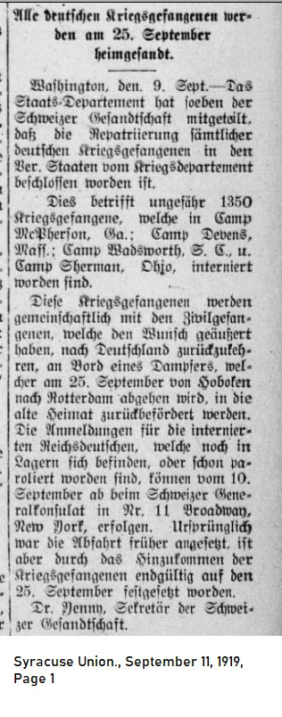 September 11, 1919, p.1 will be sent Home on September 25th _____ Washington, Sept. 9—The State Department has just informed the Swiss Legation that the War Department has decided to repatriate all German prisoners of war in the United States. This refers to approximately 1350 prisoners of war who were interned at Camp McPherson, Ga.; Camp Devens, Mass; Camp Wadsworth, S.C. and Camp Sherman, Ohio. These prisoners of war were housed together with civilian prisoners who expressed their desire to return to Germany. They will depart on board a steamship leaving Hoboken for Rotterdam on September 25th and from there transported to the old homeland. Applications for interned civilian German nationals still imprisoned or paroled may be placed with the Swiss General Consulate at No. 11 Broadway in New York city on or after September 10th. Evacuation of prisoners was originally set for an earlier date but the processing of prisoners requires the delay until September 25th.