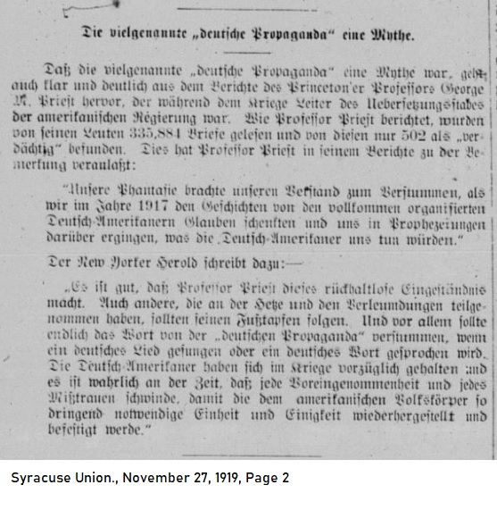 The fact that the often-cited "German Propaganda" was a myth was demonstrated clearly in a report by Princeton professor George M. Priest, who was the head of the Translation Staff for the American Government during the war. As Professor Priest reports, of the 335,884 letters read by his people only 502 were found to be "suspicious." In his report Professor Priest offered this comment: "Our imagination silenced our reasoning ability when we gave credence to the belief that in 1917 the German-Americans had been fully organized. It led us to prophecized what the German-Americans would do to us." Concerning this the New York Herold wrote: It's a good thing that Professor Priest has acknowledged this baseless assertion. Others who have taken part in the rabble-rousing and slander should follow in his footsteps. Once and for all let's set aside the term "German Propaganda" whenever a German song is sung or a German word is uttered. German-Americans conducted themselves splendedly during the war and it's about time that all prejudice and mistrust disappear so that the American people can regain and maintain the necessary unity and singleness of purpose." |