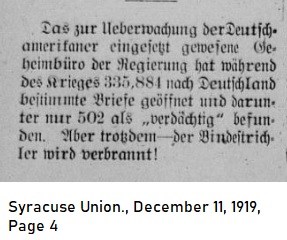 December 11, 1919, p.4 The surveillance of German-Americans by the secret bureau established by the government during the war opened 335,885 letters destined for Germany and only found 502 "suspicious." But despite this people still wish German-Americans to get rid of the hyphenated descriptor. |