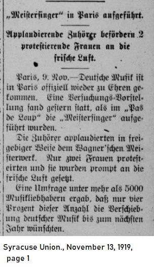 November 13, 1919, p.1 _____ Applauding Audience carries Two Protesting Women out of the Theater Paris, November 9th—German music has regained its honored status in Paris. A trial performance was given yesterday as the "Meistersinger" was performed at "Pas de Loup." The audience heartily applauded Wagner's masterwork. Only two women protested and were promptly dispatched outside. A survey of over 5000 music lovers revealed that only four percent of those polled wanted German musical performances suspended until next year. |