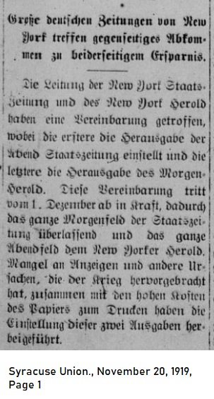 The heads of the New York Staats-Zeitung and the New York Herold have reached an compromise whereby the Staats-Zeitung will issue the evening newspaper and the Herold will issue the morning edition. This agreement goes into effect on December 1st with the Staats-Zeitung ceding the morning readership and the Herold suspending its evening sales. Lack of advertisers and other circumstances relating to the war along with the higher cost of print paper have prompted these two newspapers to this arrangement. |