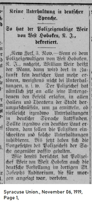 _____ So Police Commissioner Weir of West Hoboken, N.J. has decreed ___ New York, Nov. 3—According to the Police Chief of West Hoboken, N.J., William Weir, not a word in German shall be spoken in the future, at least not a public performances, etc. The Police Chief has ordered all his subordinates to sniff around all city halls and theaters in order to investigate whether any performances are taking place in the German language. If German is uttered anywhere in the city police are supposed to interrupt and squelch such activities. Thus far the police chief's superiors have remained mute on the subject. As already reported Police Chief Weir of West Hoboken has already banned the German performance schedule for tomorrow at St. Joseph's Auditorium. |