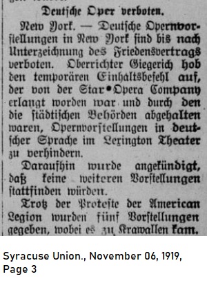 German Opera Banned New York — Performances of German operas in New York are forbidden until the peace treaty is signed. When petitioned by the Star Opera Company, Superior Court Judge Giegerich temporarily lifted the injunction, which had been put in place by the metropolitan authorities in order to hinder the performance of operas in the German language at the Lexington Theater. Subsequently it was announced that no further performances would be scheduled. Despite the protest of the American Legion five performances were given. These performances led to rioting. |