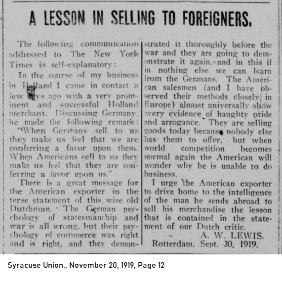 The following communication addressed to the New York Times is self-explanatory: In the course of my business in Holland I came into contact a few days ago with a very prominent and successful Holland merchant. Discussing Germany, he made the following remark: "When Germans sell to us, they make us feel that we are conferring a favor upon them. When Americans sell to us thet make us feel hat they are conferring a favor upon us." There is a great message for the American exporter in the terse statement of this wise old Dutchman. The German psychology of statesmanship and war is all wrong, but their psychology of commerce was right and is right, and they demonstrated it thoroughly before the war and they are going to demonstrate it again, and in this if nothing else we can learn from the Germans. The American salesmen (and I have observed their methods closely in Europe) almost universally show every evidence of haughty pride and arrogance. They are selling goods today because nobody else has them to offer, but when world competition becomes normal again the American will wonder why he is unable to do business. I urge the American exporter to drive home to the intelligence of the man he sends abroad to sell his merchandise the lesson that is contained in the statement of our Dutch critic.
