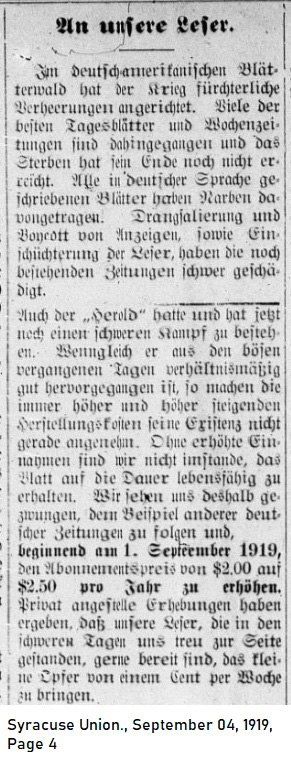 ___ The war has leveled a devastating toll on the German-American Press. Many of the best dailies and weekly newspapers have gone aground and the death thoes have not yet reached their conclusion. All periodicals written in the German language bear deep scars. Bullying and boycotting by advertisers plus intimidation of the readership have severely wounded the periodicals that remain. Even the Herold has fought and continues to fight in order to survive. Even though it has emerged relatively intact from the recent bad times, ever increasing costs of production threaten its existence. Unless we raise our prices we are unable to keep the newspaper alive. We find ourselved forced to follow the example of other German newspapers, so beginning September 1, 1919 the price for subscription will rise from $2.00 to $2.50 per year. Privately obtained surveys have determined that the readership, which has remained loyally at our side during the difficult times, will gladly make the small sacrifice of one penny per week. |
