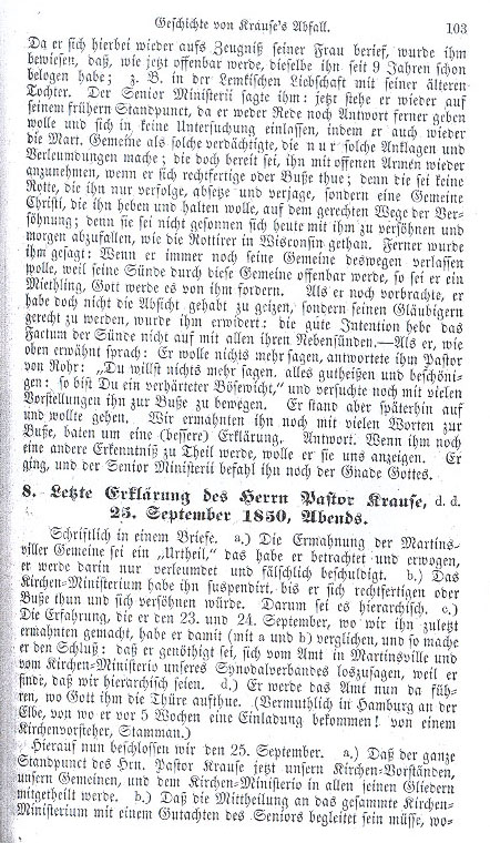 c) Pastor Krause's opinion is this, that he charges both the congregation in Martinsville and the church ministry, as indicated in his malevolent letters of September 6th and 9th, and that he once again states, as he had previously, that he will not accept church discipline for resigning from his ministerial post, and he denies that this stance is sinful. Buffalo, October 1, 1850