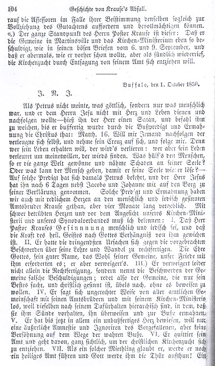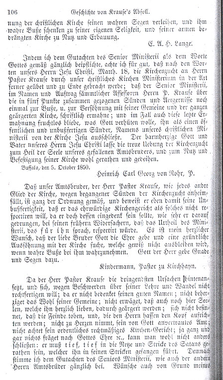 E. A. H. Lange. Since, in my opinion, the verdict of the Senior Minister is entirely in accordance with the word of God, I consider it a good thing that, as spoken by our Lord, Jesus Christ in Matthew 18, further church discipline was administered to Pastor Krause by our Christian church ministry and has now been brought to an end; that the Senior Minister advised Pastor Krause in writing to repent, in the name and representing the assessors, for sins and turmoil summarized in five points and warned him to reconcile with his congregation and the entire scandalized church. In the event that this final warning remain unheeded, God forbid, let him be excommunicated from the church of Jesus as a blatant and unrepentant sinner in the name of our Christian ministry. May the merciful God and Father of our Lord, Jesus Christ, permit this true exercise of church discipline to become a healing agent to the soul of our fallen ministerial brother; may it be well advised and ordained for the benefit and fortification of His church. Buffalo, October 5, 1850