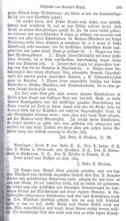 May the Lord, Our God give all my dear ministerial brothers in Christ His blessing and mighty counsel and the Holy Spirit, in this difficult situation; may He give me righteous Christian judgment to take a true stance on the matter so that the true church of Jesus, which rejoices in true love of truth and rejects injustice, will be found here on earth in all its righteousness. I ask my brothers in office to render their decision, to report what has happened; despite all this turmoil I remain sincerely united with them and with all our beloved congregations in Jesus Christ. Joh. Andr. A. Grabau, Senior Minister Submit to: His Eminence, Pastor von Rohr; His Eminence, Pastor Lange; His Eminence, Pastor Müller in Milwaukee and Freystadt; His Eminence, Pastor Kindermann in Kirchhayn; His Eminence, Pastor Winkler in Detroit.