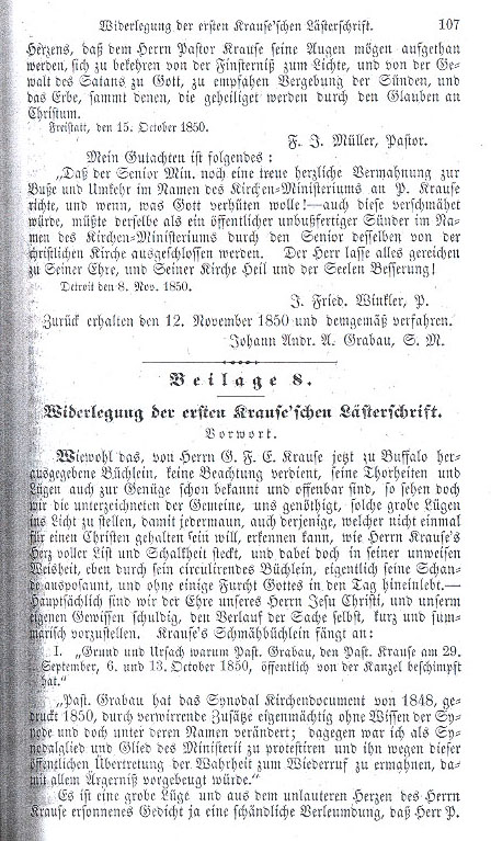 Supplement 8 Refutation of Krause's First Libelous Writing Although the little book, which is currently being published here in Buffalo by Pastor G. F. E. Krause, deserves no consideration since his foolishness and deceitfulness are already sufficiently known, we, the undersigned, see that it is necessary to bring such gross lies to light for the congregations, so that everyone, even those who are not deemed Christians, may recognize how Pastor Krause's heart is filled with cunning and villainy and how, in his witless reasoning, he parades his own shame through his little circulating book and accustoms himself to living in broad daylight without the fear of God. — Above all else we are duty bound for the honor of our Lord, Jesus Christ, and our own consciences to present a brief summary of the course of events. Krause's libelous little book begins: I. "Reasons and cause why Pastor Grabau publically insulted Pastor Krause from the pulpit on September 29th, October 6th and 13th, 1850. "Pastor Grabau altered the synodal church document of 1848, printed 1850, by adding complicated supplements; he did this on his own authority without the knowledge of the synod and in its name; as a member of the synod and the ministry I protested against this and warned him to recant for this blatant violation of the truth so that all vexation would be avoided." This is a slanderous lie, and having issued from the ignoble heart of Mr. Krause's fiction it is a shameful piece of libel, |