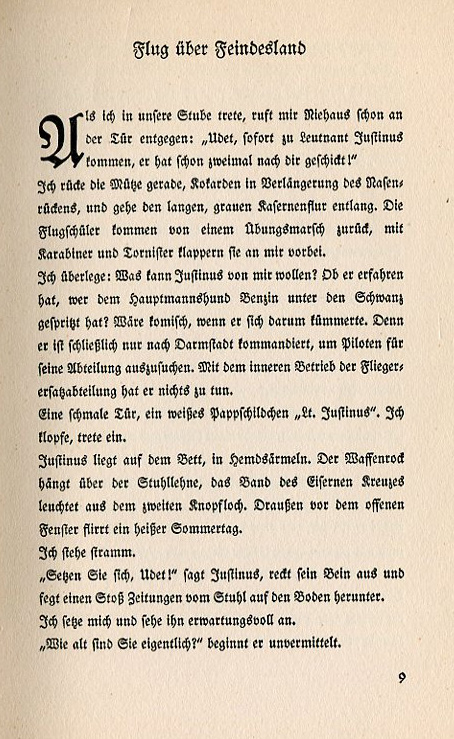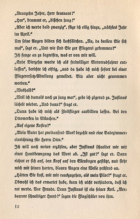 As I enter our parlor Niehaus calls to me from the door: "Udet, go immediately to Lieutenant Justinus. He's sent for you twice!" I put my cap back on, straighten my ensignias and go down the long, gray barracks hallway. The flight students are returning from a practice march and they clatter by with their rifles and backpacks. I wonder, What does Justinus want with me? Did he find out who sprayed gasoline under the tail of the Captain's dog? It would be funny if he cared about such a thing. Has he finally been order to Darmstadt to look for pilots for his division? He has nothing to do with the operations of the pilot replacement division. A narrow door, a white paper name plate, "Lt. Justinus." I knock and enter. Justinus lies on the bed in his shirtsleeves. The uniform jacket hangs over the back of the chair, the ribbon from the Iron Cross sparkles from between the two button holes. Outside beyond the open window it's a hot summer day. I stand at attention. "Have a seat, Udet!" Justinus says as he stretches out his leg and knocks a pile of newspapers off the stool onto the ground. I sit and look at him expectantly. "How old are you?" he immediately begins. |