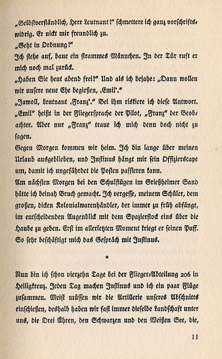 "Of course I do, Lieutenant!" I sputter out contrary to regulations. He nods to me amicably. "Get your things in order!" I stand up and stand at attention. At the door he calls back to me. "Are you free tonight?" And as I say yes, "Then let's celebrate our new partnership, Emil." "Very good, Lieutenant Franz." It would be risky replying to him in this manner. "Emil" is aviation talk for pilot and "Franz" refers to the observer. However I wouldn't dare to respond with just "Franz." We came home in the morning. I stayed out way past my leave time and Justinus put his officer's cape around me so I could get past the sentry without being arrested. The next morning with the trainer planes in Griessheimer Sand I nearly crashed. My student, a large, fat grocer always flared out too early at a decisive moment. I usually corrected him by tapping my walking stick on his cap. Only then would he catch his wind. This time I forgot because I was so distracted by the conversation I had with Justinus. I've been at the Heiligkreuz 206 Flight Division for fourteen days. Each day Justinus and I fly a couple of times together. Mostly we adjust the artillery in our section so we always have the same terrain beneath us; the Drei Ähren [Les Trois Epis resort area in Alsace], the black and white lakes |