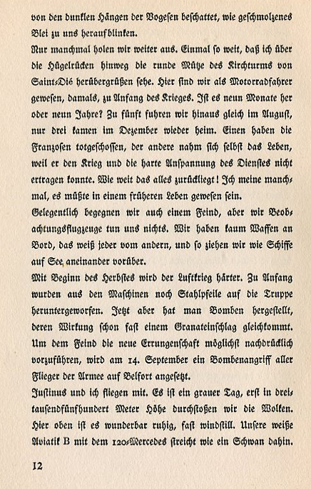 which are shadowed by the peaks of the Vosges Mountains. The lakes seem to flash at us like molten lead. Only seldom do we strike out farther. Once so far that I could see over the hill to the round cap of the church tower of Saint Dié. We had been there as motorcycle drivers at the beginning of the war. Was that nine months or nine years ago? Five of us drove out in August. Only three came home in December. One was shot dead by the French and the other took his own life because he could not bear the war and the strains of service. How far back that seems now. I think it might have been in an earlier life. Occasionally we meet up with an enemy but we don't do anything to observation planes. We seldom have weapons on board. Each knows that about the other so we're just ships at sea passing each other. At the beginning of autumn the war in the air got harsher. To begin with steel arrows were thrown out of the planes into the troops below. Now we have bombs. Their workings are similar to those of grenades. In order to impress upon the enemy this latest development a bomb attack on Belfort, carried out by all the army pilots, was held on September 14th. Justinus and I flew along with them. It was a gray day. We finally cleared the clouds at three thousand five hundred meters. Up here it is wonderfully quiet with almost no wind. Our white Aviatik B model with the 120 horsepower Mercedes engine stroked through it like a swan. |