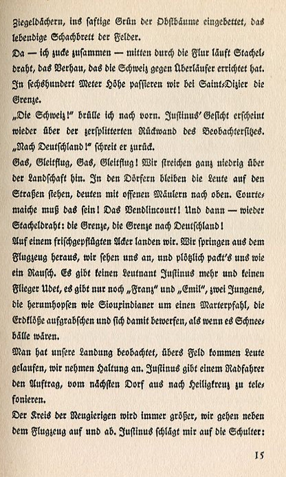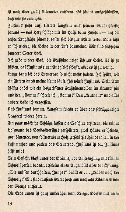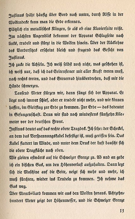 Justinus peers overboard to the ground. You can see the earth from a hole in the cloud cover. Suddenly there's a metallic cling as if a piano string has snapped. In the next moment the plane lurches to the left, spins and dives through the clouds. Above the backrest of the forward seat Justinus' face appears pale and puzzled. I shrug my shoulders. I don't know myself what happened. I only know that I had to push the side-steering cable with all my might and turn the steering wheel all the way over until my hands hurt. We dive a thousand meters then the engine starts. It's still descending but it stops spinning and we hope to glide back to the ground. Back to the ground — that means imprisonment. We're at least fifteen kilometers from the German front. Justinus points to the right upper wing. I see it: the armature to which the tension cable is attached has torn off. The cable is blowing in the wind with the force of the air brushing it against the upper wing. We glide eastward towards the Swiss border. Now and again I give it a little gas to stave off the altitude loss. The plane leans more and more to the side and I fear it will go into a tailspin again. I let off on the gas. We come out of the clouds at Montbéliard. The altimeter indicates eighteen hundred meters and the Swiss border |