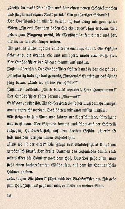 "You know what? Let's make a new armature here and fly back on our own power." A magnificent thought! The village blacksmith at the corner looks at the thing with a wrinkled forhead. "You can have a new one in three hours," he says. We go back to the plane. The villagers run after us as though we're tightrope walkers. A gray auto speeds up the county road then stops. An officer gets out. The crowd, which surrounds us, makes a path for him. The pilots' staff officer comes up to us. Justinus reports. The staff officer shakes both our hands. "It's great that you made it, gentlemen." He walks over to the plane. "Where did it break?" Justinus beams. "It's already repaired, Captain!" The staff officer turns around. "Whaaaaat?" He's beside himself. Such a mechanical failure must be submitted for examination at the testing office. You must have known that! We get into his car and drive to the blacksmith. We're quiet and upset. The smithy meets us at the threshold. He has the pride of a craftman all over his face. "Here!" He hands us the newly finished armature. "And where is the old one?" The staff officer's question sounds unusually harsh. The smithy's broad thumb points backwards over his should towards the yard. The gate is open. We see a tall pile of manure where chickens are clucking as the sun shines. "Go look for it!" the staff officer says as he looks to me. I go to the yard. Justinus goes with me. He remains at my side. |