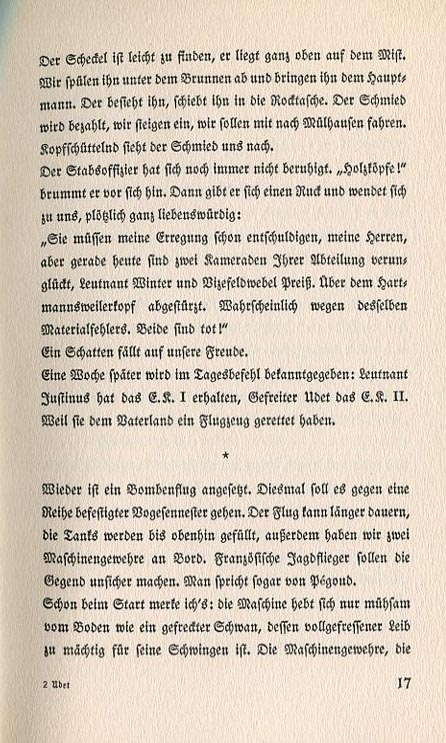 is still twelve kilometers away. It appears we're not going to reach it. Justinus stands up, slowly unbuckles himself from the observer's seat — my heart's in my throat just watching this — gets out on the right wing and gropes his way to the middle strut. There he lowers himself, his legs jostling in the breeze. We're at an altitude of sixteen hundred meters. I give it more gas and the machine leans to the side. Justinus is trying to balance the load but it's not enough. I can't hold the steering wheel any longer. I feel a quaking running through my arm. I gesture to Justinus. My arm shakes like a loosened piston spasming. Come on! I cry. Come on! I forget the Lieutenant and everything else. And Justinus comes back. He creeps back over the slanted wing. The earth beneath us is untouched by war. Villages with red |
