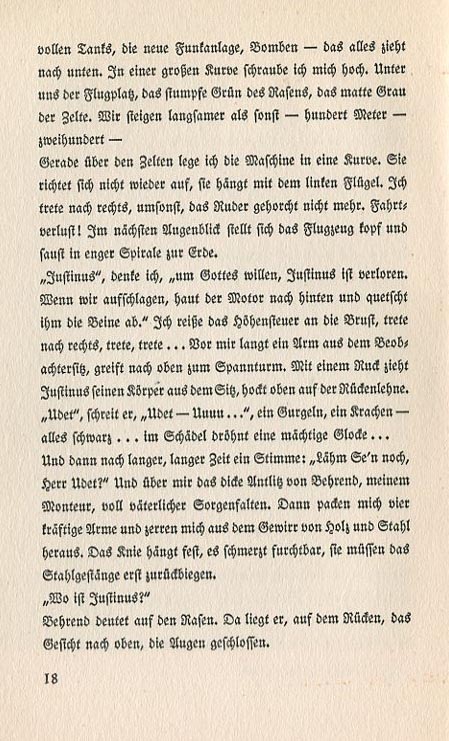 the full tanks, the new radio apparatus, the bombs — it all drags the plane down. Spiralling in wide curves I gain altitude. Below us is the airfield, the dull green of the grass, the flat gray of the tents. We climb more slowly than usual — one hundred meters — two hundred ... Still above the tents I bank the plane to turn. The plane doesn't straighten out. The left wing hangs down. I steer to the right but nothing happens, The rudder won't obey. Loss of steering control. In the next moment the plane flips over and starts spiralling to the ground. "Justinus," I think. "Oh dear God, Justinus is done for. When we hit the engine will push back and take off his legs." I pull the elevator control up to my chest. Turn to the right, turn, turn... In front of me an arm reaches out from the observer's seat and grabs the rigging tower. With a jerk Justinus pulls his body out of the seat, and flips over the backrest. "Udet," he shouts, "Udet — Uuuuu..." A gurgeling, a crack, everything goes dark...a loud gong goes off in my skull...And then after a long, long time a voice: "Can you move, Mr. Udet?" Above me is the broad face of my mechanic, Behrend, full of fatherly concern. Four powerful arms lift me up and extract me from the mangled heap of wood and steel. My knee hangs stiff. It hurts dreadfully. First they have to bend back the steel rail. "Where is Justinus?" Behrend points to the grass. He's lying there on his back, his head raised and his eyes shut. |