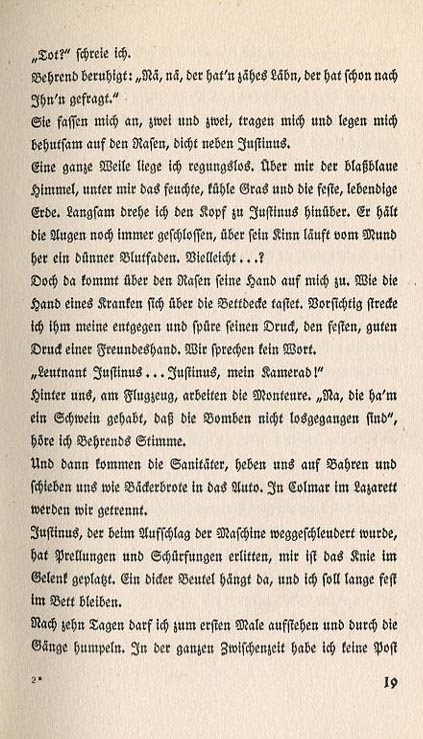 "Dead?" I cry. Behrend assures me. "No, no. He's tough. He's already been asking for you." They grab me, two by two, carry me and carefully lay me down on the grass next to Justinus. For a long time I lay motionless. Above me is the pale blue sky; below me the damp, cool grass and the firm, living earth. Slowly I turn my head towards Justinus. Hie eyes are still closed. A thin thread of blood flows from his mouth and down his chin. Maybe...? Then he raises his hand off the grass towards me, like the hand of a sick person touching his blanket. Carefully I stretch my hand towards his and make contact. It's the feel of a firm, healthy handshake of a good friend. We don't speak. "Lieutenant Justinus...Justinus, my comrade!" Behind us the mechanics work on the plane. I hear Behrend's voice. "They're lucky the bombs didn't get loose." Then the medics come, put us on stretchers and shove us into the vehicle like loaves of bread. We're taken to the hospital in Colmar. Justinus, who was tossed from the plane on impact, has bruises and contusions. My leg is in traction, suspended by a fat sack. I'm supposed to stay immobilized and in bed. I can get up for the first time after ten days and hobble around the hallways. In the interim I didn't get a single letter from home.