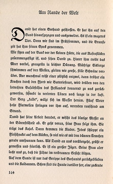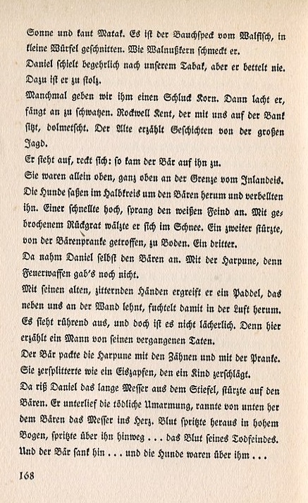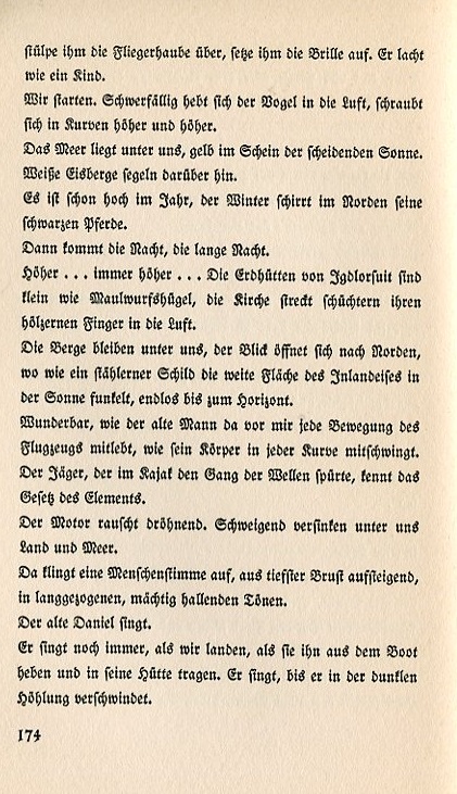I strap a pilot's cap and goggles onto him. He laughs like a child. We take off. Clumsily the bird lifts into the air, banking and climbing higher and higher. The sea is beneath us. It has a yellow cast from the sunshine. White icebergs float on the surface. Most of the year has already passed. Old man winter looms to the north on his dark horse. Then night will come, the long night. Higher, ever higher. The earthen huts of Igdlorsuit are small like mole mounds. The church bashfully extends its wooden fingers into the air. The mountains lie beneath us and the vista to the north opened before us where like a steel shield the broad expanse of inland ices shimmers in the sun endlessly to the horizon. It's wonderful how the old man before me moves with the airplane. His body steers into every turn. The hunter who traces the path of the waves in a kayak knows the elemental laws. The motor drones. Silently the land and the sea sink beneath us. Then a human voice sounds, rising from the greatest depth of his chest; long, drawn out, powerfully resonant tones. Old Daniel is singing. He's still singing as we land, as they lift him out of the boat and carry him back to his hut. He sings until he disappears into the dark passage. |