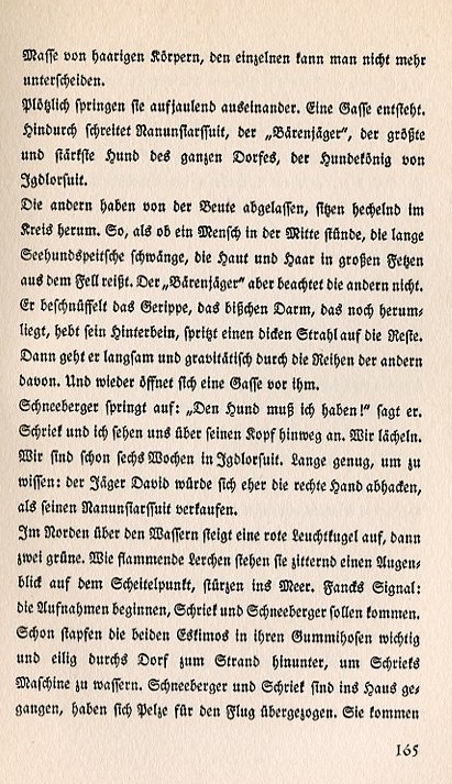 mass of hairy bodies whereby one can't tell one from the other. Suddenly they jump aside and howl. A passageway opens. Nanunsiarssuit steps through. He is the "bear hunter," the largest and strongest dog in the entire village, the dog king of Igdlorsuit. The others have abandonned the booty and pant as they sit in a circle. And as if he were a human presenting a lesson in the middle, he yanks at long strip of seal flesh and separates the fat from the hair and skin. However the "bear hunter" doesn't pay attention to the others. He sniffs at the ribs and a bit of the intestines that are left, raises his hind leg and sprays a thick stream on the remainder of the seal. Then he strolls slowly and seriously between the rows of the other dogs. A pathway again opens for him. Schneeberger jumps up: "I must have that dog!" he says. Schriek and I look at each other over his head and smile. We've been in Igdlorsuit for six weeks. Long enough to know that hunter David would rather hack off his right hand than sell his Nanunsiarssuit. In the north a red ball of light rises over the water, then two green balls. Like fiery larks the flare shimmer for a moment at their zenith then plunge into the sea. Fanck's signal: the photo session begins, Schriek and Schneeberger are supposed to come along. The two eskimos stomp about heavily in their rubber pants and rush from the village to the strand below in order to put Schreik's machine in the water. Schneeberger and Schreik have gone into the hut and put on their furs for the flight. |