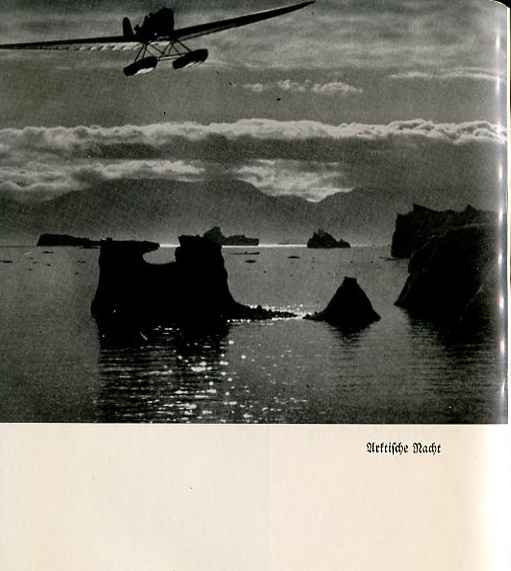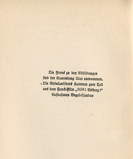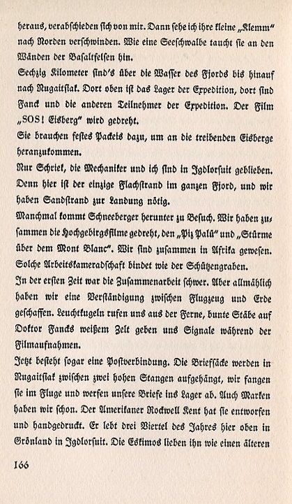 They come out and say goodbye to me. I see them disappear to the north in their tiny "Klemm." Like sea swallows they dive down into the walls of basalt rock. It's sixty kilometers over the water of the fjord to Nugaitsiak. Over there is the expeditionary campsite with Fanck and other participants in the expedition. They're directing the film "S.O.S. Iceberg." They need hard pack ice to land on the moving iceberg. Only Schriek, the mechanic and I remained in Igdlorsuit because it's the only strip of flat surface on the entire fjord and we need a sand beach on which to land. Sometimes Schneeberger comes down to visit. Together we have directed high mountain films, "Piz Palü" and "Storm over Mount Blanc." We've been together in Africa. Such work comradery binds in the same way as the trenches. In the first days working together was difficult, but eventually we created a collaboration between aircraft and ground. Flares call us from a distance. Colorful rods of light on Doctor Fanck's white canvas give us signals during filming. Then we developed a letter exchange. Letter sacks were hung between two high poles in Nugaitsiak. We grabbed them in mid flight and dropped our letters into their camp. We already have the posters. The American Rockwell Kent designed and hand-printed them. For three-quarters of the year he resides up here in Igdlorsiut Greenland. The eskimos love him like an older brother, |