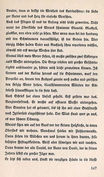because he possesses the wisdom of the disillusioned: the love of nature and the heart of a true human being. Even flying wasn't easy for us in the beginning. Dense blue ice floats below the surface of the sea. As bright and clear as glass and invisible from above. Even if one tries to touch down on the water surface there's solid surface underneath. Baier and Buchholz have already had to repair over forty holes in the first few weeks. One time I had to cut my engine and go down into the water between two icebergs. The bergs were rapidly drawing together and I could easily have been smashed to bits. I climbed out of the plane and onto a floater, then spun the propeller, got back in, grabbed the stick and flew out between the seventy-meter high shimmering blue walls into the sky. Even Schriek had an incident just yesterday. It was a fuel line break. He had to go down into the open water. It took four hours for me to drag him back to Igdlorsuit with a steel cable. There was a cross wind and it was a difficult task. In the evening we sit on the bench in front of a small wooden church. We live in the church's upper floor. Sometimes we play accordions. The girls stand around us in their colorful fur-trimmed party clothes. However most of the time we remain quite and smoke. Old Daniel, father of David, comes by. In his day he was the great hunter. He sits next to us, stretches his wrinkled hands towards the pale sun and chews Matak. |