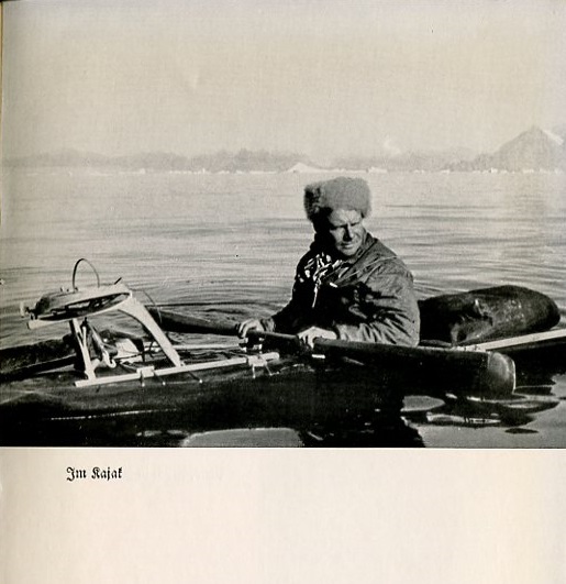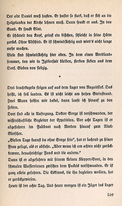 Old Daniel has to cough. He coughs so hard he has to lean on the wooden planks of the church. Then he spits in the sand. He spits out blood. He shakes his head, grins a bit then skulks back to his hut without saying goodbye. He's consumptive and won't be here much longer. Many up here are consumptive. In the northland summer in which we stay in Igdlorsuit, seven people from the village die. Seven out of seventy. Three flares rise from the camp at Nugautsiak. That means I should land. It's not easy on the high stone ledge. Two men help me along and then I run to the tents. Everything there is in an uproar. Doctor Sorge has disappeared. He is the scientific advisor for the expedition. He went off eight days ago in a faltboat going north to Rink Glacier. "You can be without Sorge for seven days," he laughingly said to his wife as he left. "But if I don't come back on the eighth day, report it to Fanck and the others." Then off he went in his tiny nag of an old boat into the small rivulets between the pack ice. He went all alone. He refused the eskimos who wanted to accompany him. Today is the eighth day, and this morning a hunter came to the camp, |