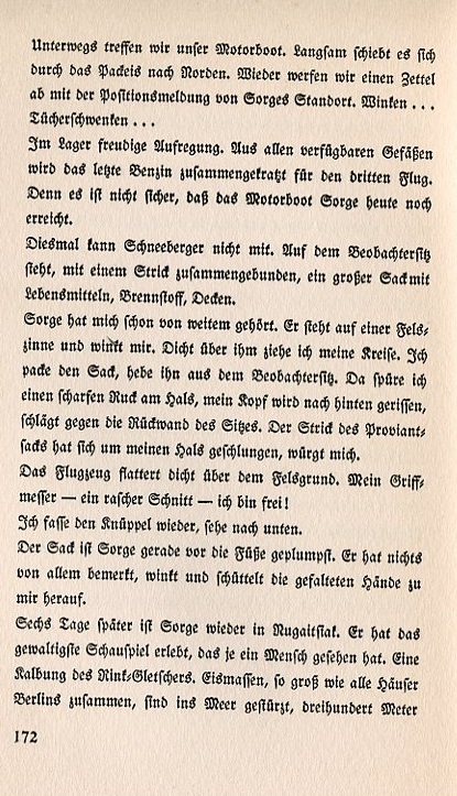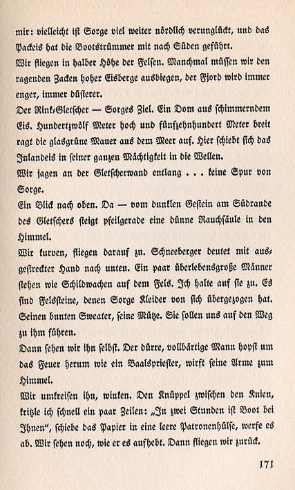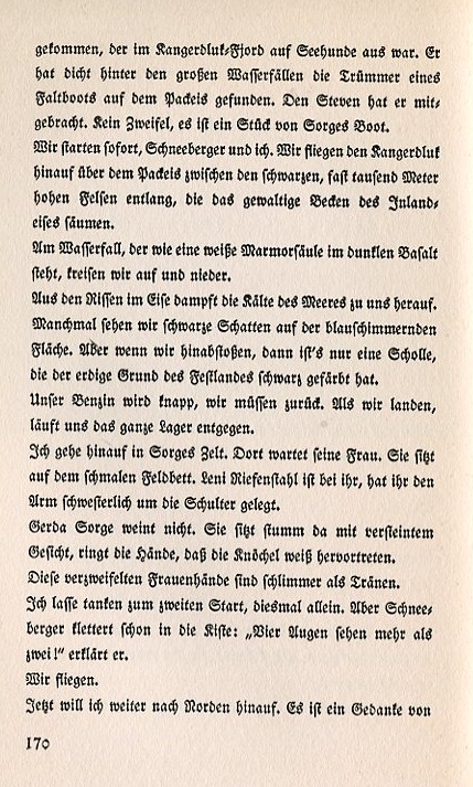 who was in Kangerluk Fjord on a seal hunt. He found the wreckage of a faltboat in the pack ice beneath a giant water fall. He brought the wreckage with him. No doubt, it's a piece of Sorge's boat. We immediately take off, Schneeberger and I. We fly over the Kangerdlut pack ice between the dark, almost thousand meter high cliffs which border the inland ice basin. At the waterfall which stands like a white marble column in the dark basalt, we circle up and down. From a rift in the ice the cold sea foams up to us. Sometimes we see dark shadows in the shimmering blue surface. But when we descend there's only a furrow darkened by dirt from the mainland. We're running out of fuel. We need to turn back. As we land the entire camp runs out to us. I go into Sorge's tent. His wife waits there. She sits on the tiny camp bed. Leni Riefenstahl is with her and has placed her arm on her shoulder in sisterly fashion. Gerda Sorge does not cry. She sits silently there with a stoney face, ringing her hands with prominent white knuckles. A woman's hands ringing in dispair are worse than tears. I get refueled for another takeoff, this time alone. But Schneeberger climbs into the crate. "Four eyes see more than two!" he declares. We fly. This time I'll go farther north. It occurs to me: |