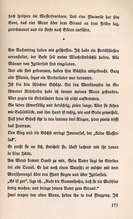 and sent up water fountains three hundred meters into the air. A tidal wave destroyed his boat, which stood four meters from the beach on the rocks and then carried off the debris to the south. We have a shooting match in the afternoon. I have donated the grand prize. The best marksman shall win my Winchester rifle. All the men of Igdlorsuit are invited. And all have come, bringing their rifles with them. They're all old flintlocks. There's even one muzzle loader among them. I'm not a bad marksman. At the competition in Richthofen's squadron I stood my ground, but against the Greenlanders I can't keep up. They load clumsily and aim slowly but they stand like basalt blocks and their hands are still as though chiseled out of stone. Just about every shot lands in the third ring and each second shot lands a bullseye. Imerarsuk, the "little water sack," wins the victory and the the rifle. He presses it to himself, strokes it, and runs back to his hut smiling. In the evening David comes to me. His father, old Daniel, lies on his deathbed. He still has one wish. He wants to fly with the human bird over the fjord and Igdlorsuit. "That's fine," I say. "Call the rubber pants squad so they can get the plane ready and bring your father to the beach." Two men carry the old man and lift him into the plane. |