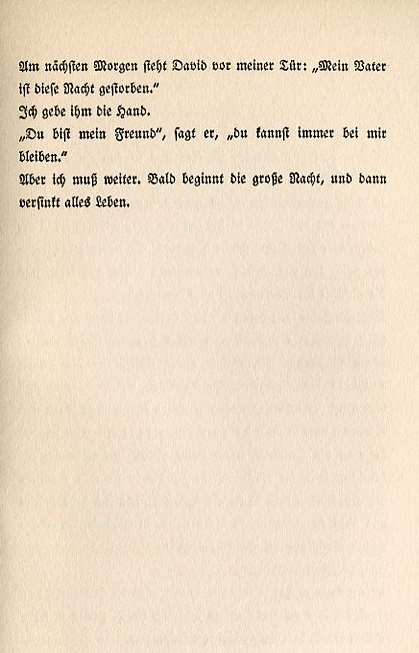 The next morning David stands at my door. "My father died this night." I give him my hand. "You are my friend," he says. "You can stay with me forever." But I must depart. Soon the great night begins and all life hibernates. |