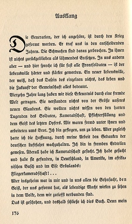 The generation to which I belong was forged by the war. It struck us during the formative years. The weak were broken by it. For them nothing is left but crippling horror. But for others of us—and here I speak for almost all the soldiers at the front—it made our will to live harder and stronger. A new will to live, which knows that the existence of the individual is nothing, that the life and the future of the society means everything. For fourteen years we have carried this acknowledgement through the entire world. It understands nothing of the greatness of our new belief. It doesn't want to know anything about the steadfast virtues of our soldiers, the comradery, the observance of duty and the spirit of the final sacrifice. We were strangers within the world and we worked for our daily bread. I flew in order to live. Yet at the same time I maintained the hope that the idea of German aviation would remain alive through my efforts. I have been to foreign parts of the world. Everywhere I have searched for comradery. I searched and I found it in Germany, in America, in the African bush and on the ice of Greenland: The comradeship of aviation!... However, hidden in us all is the yearning to identify the spirit which formed us as a vital force working within the race of people to which we are deeply bound. That has happened and for that reason I now close this book. |