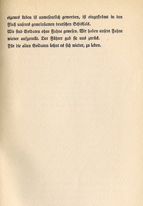 My own life is insignficant. It is mingled in the stream of our common German destiny. We have been soldiers without a flag. We are again unfurling our flag. The Führer has given it back to us. It is worthwhile to let it live again for the sake of the old soldiers. |