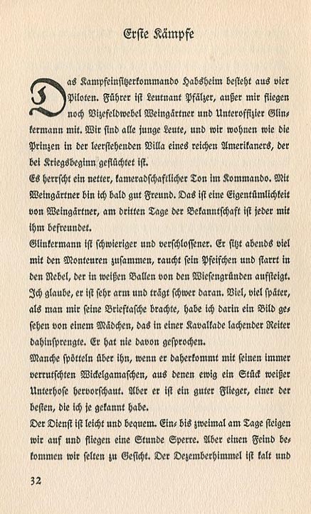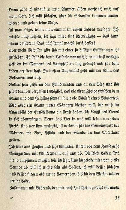 Then I go up to my room. I throw myself onto my bed. I want to sleep but the memories keep returning and give me no peace. Is a man a coward if he falls apart at the first jolt of shock? I want to comfort myself. I say it was nerves — it could happen to anyone. The next time I'll do better! But my conscience is not satisfied with such a simple explanation. It sets the harsh facts before me: You fell apart because you thought about yourself at the moment of battle and you feared for your life. In that instant I understood what it was to be a soldier. Being a soldier means thinking about the enemy and thereby forgetting yourself! It's possible that the boundry between being a man and being a coward is as slim as the edge of a sword. However whosoever wants to remain a man among men must have the strength in the moment of decision to suppress his animalistic fear. The animal in us wishes to survive at any cost. Whoever gives in to it is lost before the society of mankind, where honor, duty and belief in the fatherland are esteemed. I go to the window and look down. Below, in front of the house, Weingärtner goes back and forth with Glinkermann. Perhaps they have never felt this as much as I do right now. And I promise myself, from this hour on I will be nothing other than a soldier. I will shoot better and fly better than my comrades until I am able to redeem myself from this stigma. Along with Behrend, who followed me to Habsheim, |