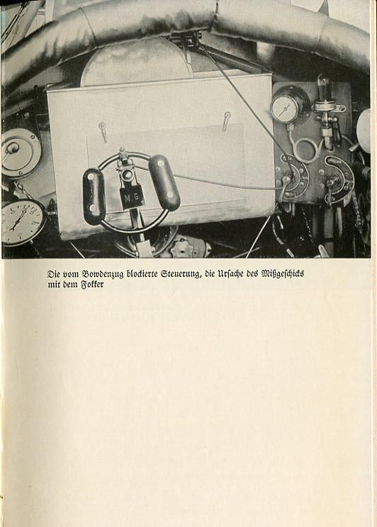Caption under photograph reads: The steering mechanism blocked by the Bowden control cable, the cause of the mishap with the Fokker. |