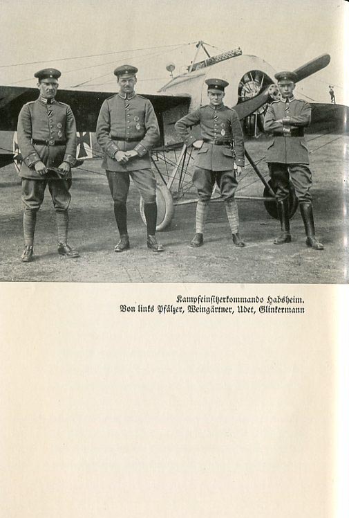 Caption under photograph reads: The Single Seater Fight Command Unit in Habsheim. From left to right Pfälzer, Weingärtner, Udet, Glinkermann |