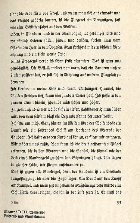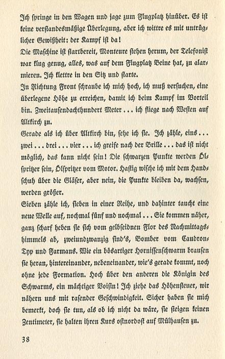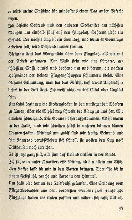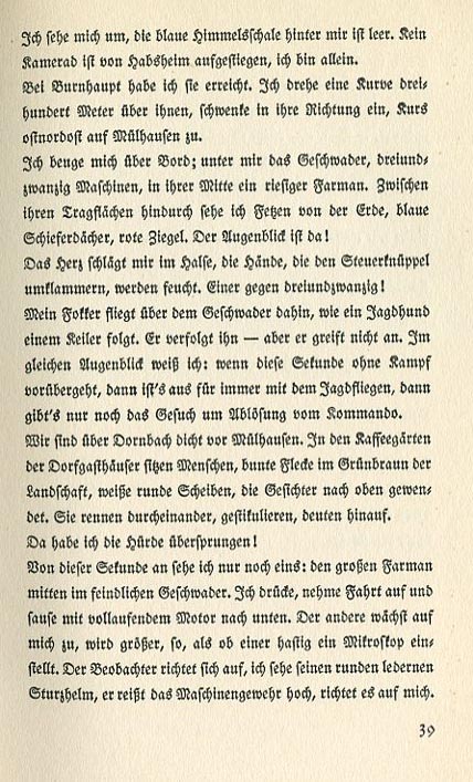 I look around. The blue sky behind me is empty. No comrade has flown up from Habsheim. I am alone. I reach them at Burnhaupt. I bank into a curve three hundred meters above them, swerve in their direction, course east by northeast towards Mülhausen. I peer over the side. The squadron is below me. Twenty-three planes with a giant Farman in their midst. In between their wings I see parts of the ground, blue slate roofs, red chimneys. The moment is now! My heart pounds in my throat. My hands, grasping the control stick, are damp. One against twenty-three! My Fokker flies above the squadron from behind like a hunting dog chasing a wild boar. He pursues but does not attack. In that moment I know: If this second passes without fighting then it's out for good from the fighter squadron. There will only be the petition for resignation from Command. We are over Dornbach near Mülhausen. In the coffee garden at the village guest house people sit, colorful flecks in the green-brown landscape. Round, white targets who turn their faces upward. They run about, gesticulating, pointing up. Then I jump over the hurdle! From this second on I only see one thing: the large Farman in the middle of the enemy squadron. I pull down, take off and speed down at full throttle. The others amass towards me, growing larger, like something hastily put under a microscope. The observer sits up. I see his round leather crash helmet. He raises the machine gun high, directing it at me. |