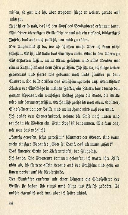 He must know that as well as I do, but he continues flying right at me. Now he's so close that I can see the observer's head. With his four-cornered goggles he looks like a giant, angry insect who's coming after me just to kill me. The moment has come when I must shoot. But I can't shoot. It's as if the horror has turned the blood in my veins to ice, numbing my arms and and all thought ripped out like a cat clawing at my brain. I sit there, I fly on, I stare over to the left at the Caudron as if I'm tied up. Above me the machine gun belches. Metallic clacking against my Fokker, a shiver runs through the entire plane, a massive hit to the rear, my goggles ripped off of me. Splinters, glass shatters from the goggles and my hand becomes wet from the blood. I press the control stick, set the nose down and dive into the clouds. My head is numb. How did that happen? Was it possible? "That was lousy, you were a coward!" the motor hammers. And then my only thought, "Thank God no one saw that!" The fluid green of the pine treetops, the airfield. I land. The mechanics come running. I don't wait for their help. Alone I climb out of the plane and go past them to the infirmary. The medic removes the glass splinters from the goggles with a pair of tweezers. They've bored themselves into the flesh around my eyes. It should hurt but I don't feel anything. |