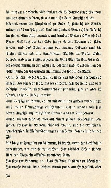 I go to work. We affix a target with a silhouette of a Nieuport, seen from behind as one would see him during an attack. In the evening when the flight operation is finished I position the target right on the field. From an altitude of three hundred meters I descend at a steep incline. At one hundred meters I open fire. Shortly before reaching the earth I intercept the target, climb back up and start the game anew. Behrend must count the hits and signal me. Shots to the engine are double the points and ten hits earn him a glass of beer. Guns jam often, all too often. Behrend and I work to eliminate the problem sometimes late into the night. Results improve. In fact they improve surprisingly fast. I'm very happy until I discover that Behrend helps out with a pencil. He says it's out of comradery for me but I believe it's for his love of beer. An order comes down stating ammunition must be used sparingly. I have to curtail my flight exercises. To make up for it we now attack French trenches from the air. One evening I was delayed in attacking the trenches. It was in the north close to Thann and the machine gun nests, secreted in fields of pines, made for an attractive target. It was night when I returned to the airfield. They had lit pitch torches to guide me in. Their red light flickered over the field with diffused and unsteady light. I start to land. The ground is difficult to see. I hit, only a light hit to the undercarriage but |