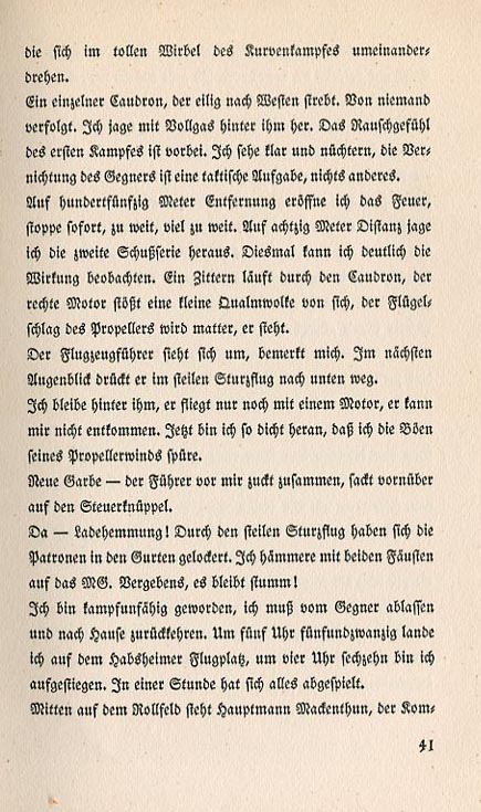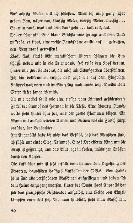 I want to shoot at eighty meters, but I must go steady. Closer, getting closer. Fifty meters, forty meters, thirty...now check his flightpath...tack, tack, tack. There, he deviated! A blue flame jettisons from the exhaust pipe. He cants. A white trail of smoke plumes forth—Hit, struck in the gas tank! Clack, clack, clack. Incoming shots hit with a metallic clang near me in the front wall. I turn my head. There are two Caudrons behind me showering me with bullets. I'm totally at peace. This is like it was at the airfield: stick forward and nosedive. I descend another three hundred meters. Like a giant torch hurdling out of the sky the tail of the Farman spins down past me. He trails a black cloud of smoke as flames flare out. A man with sprawled arms and legs like a frog keels over. It's the observer. At that moment I don't have the feeling that these are human beings. I only feel one thing: Victory, triumph, victory! The iron ring around my chest has burst free and my blood courses through my body in free, powerful strokes. The air above me is filled with the thunderous organ song of motors. In between there's the hasty belching of the machine guns. All available planes have taken flight fom Habsheim and have engaged the enemy. With the force of their attack the French squadron has scattered and individual battles have ensued. Anywhere one looks he see planes |