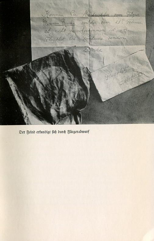 Caption under photograph reads: The enemy makes inquires by dropping notes. The folded section reads: Habsheim Airfield The note reads: Could you send reports concerning pilot Maurice Riviers, who has not returned since February 25th, to the Airfield at Fontaine? Thanks |