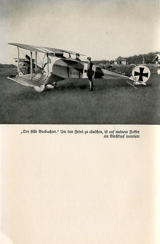 Caption under photograph reads: "The Quiet Observer." In order to fool the enemy a tin head is mounted on my Fokker. |